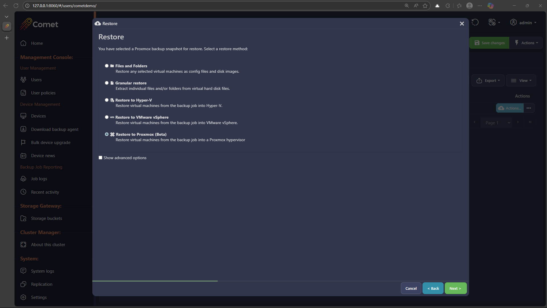 +There are several restore options available. You can restore to directly to Proxmox, Hyper-V, or VMware, or perform granular restores of files and/or folders, or restore the disk image file in .img format.